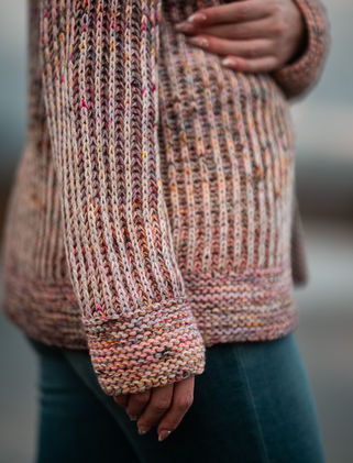 Body worked flat in two color brioche, finished with a marled garter hem