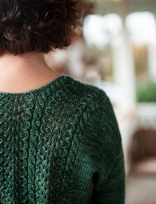 This seamless top down sweater begins at the shoulders with short row shaping to form the V neckline. The lace and cable panels are integrated into both the front and back and flow cleanly from the shoulder join into the body.